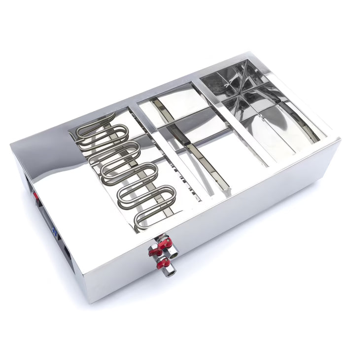 Denna chokladsmältare i rostfritt stål är utrustad med 3 stycken 1/3 GN-behållare och matchande lock. Den har 4 gummifötter som gör att den står stadigt på underlaget. Displayen är lätt att använda och består av en på/av-knapp och en digital temperaturregulator. Du kan använda pilknapparna för att ställa in önskad temperatur och den digitala displayen låter dig hålla ett öga på uppvärmningsförloppet. Temperaturen kan ställas in per grad från 3 till 412°C. Chokladsmältaren är utrustad med en kran, med vilken du enkelt kan tömma chokladsmältaren. Chokladsmältaren har också en ångutloppsventil. Ångan som bildas vid uppvärmningen av vattnet kan på så sätt enkelt ledas ut ur apparaten.