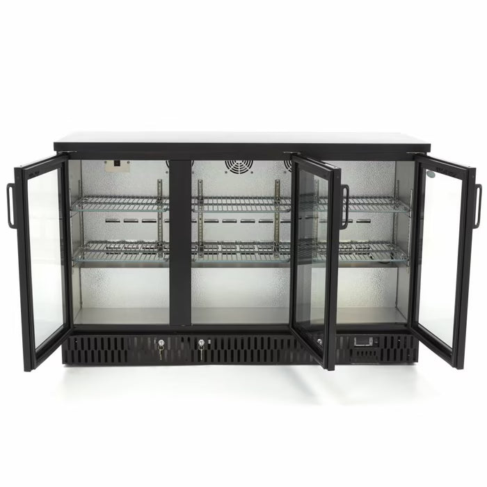 För att presentera drycker och snacks på ett professionellt sätt och samtidigt hålla dem kylda behöver du detta svarta dryckeskylskåp med lyxig finish. Den har en kapacitet på 323 liter och är utrustad med tre gångjärnsdörrar för enkel åtkomst. Dessa är dubbelglasade för att hålla produkterna perfekt kylda tills de behövs. Alla dörrar har ett lås för att stänga kylskåpet helt. Bakom varje dörr finns två justerbara hyllor så att du kan anpassa din layout efter dina behov. För att produkterna i dryckeskylen ska komma ännu bättre till sin rätt har den inbyggd LED-belysning.
