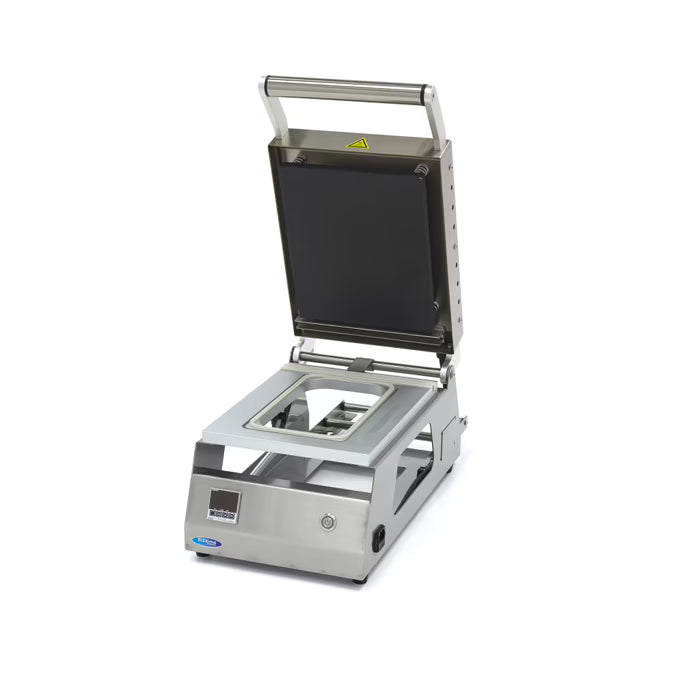 Den här lyxiga förpackningsmaskinen är lämplig för snabb och effektiv försegling och förpackning av olika livsmedel, t.ex. kött, fisk, frukt och grönsaker. Med hjälp av denna maskin kan du försegla 6-8 brickor per minut. Den kan också användas för att försegla en mängd olika former och storlekar på brickor.