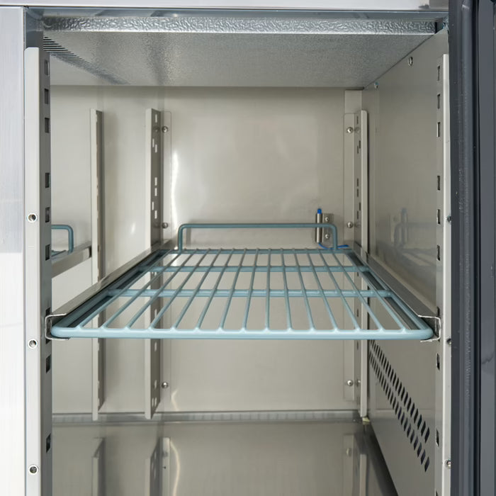 Kylbänken har också LED-belysning inuti, vilket ger dig en bra överblick över ditt lager och ser snyggt ut. Detta gör att du kan placera kylbänken framför gäster/kunder. Den rostfria stålskivan är till exempel lämplig för att skära och hacka grönsaker. Men du kan också förbereda dina desserter. Hörnen är snyggt rundade och det rostfria stålet är lätt att rengöra. Det förhindrar också korrosion på bänkskivan.