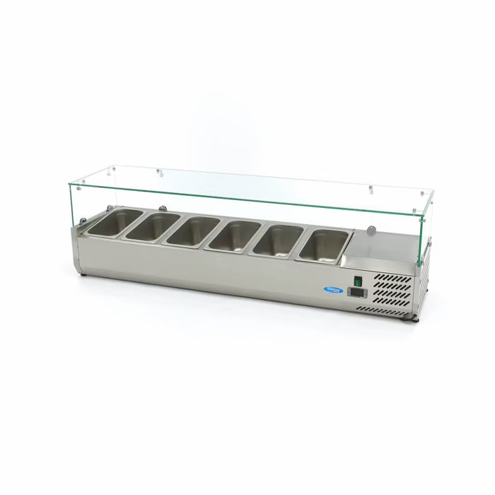 Den här ytmonterade kyldisplayen har ett glaslock och är 150 cm brett. Den har plats för sex 1/3 GN Gastronorm-behållare där du kan placera ingredienser som du behöver ha till hands och hålla dem svala.
