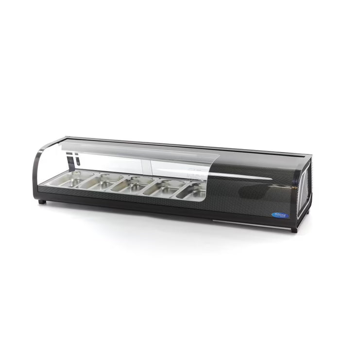 Den här tapasdisplayen är lämplig både för att presentera mat och för att hålla små produkter svala. Det böjda glaset och det svarta höljet ger den här vitrinen ett lyxigt och elegant utseende. Den är idealisk att placera på en disk så att den är synlig för dina gäster. Tapasdisplayen är lämplig för att presentera tapas, men också för att hålla sushirätter och fiskprodukter svala. Denna professionella tapasvitrin kan användas i kombination med GN-behållare. Den här sushidisplayen levereras som standard med 5 x 1/3 GN-brickor.