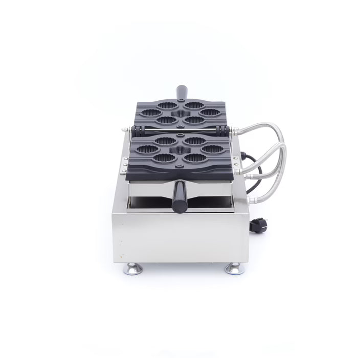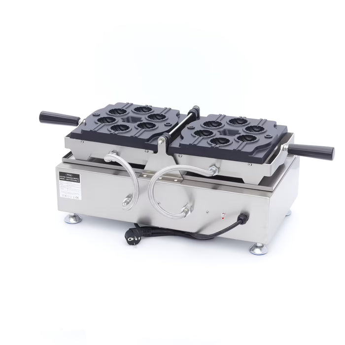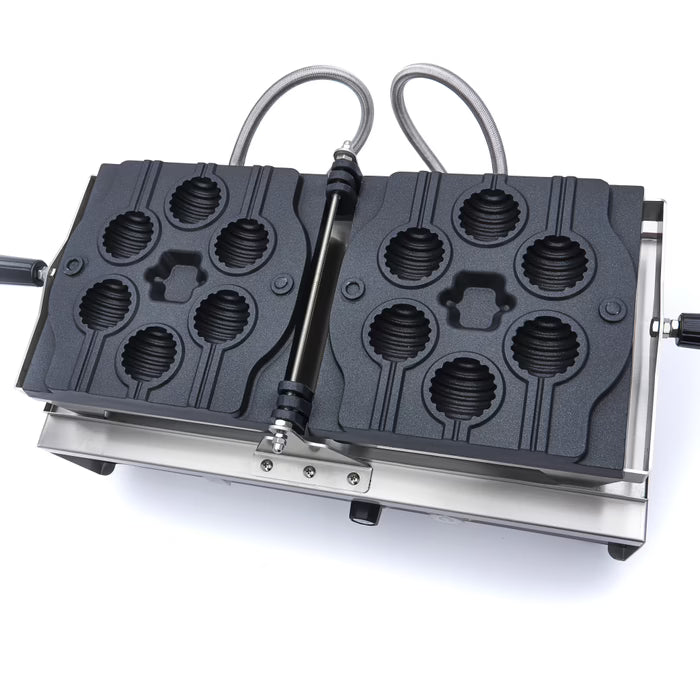 Den här elektriska våffeltillverkaren är tillverkad i en roterande modell så att du kan vända alla dina cak pops i ett svep utan att behöva ta bort dem från bakplåten. Detta säkerställer att smeten kan kollapsa på båda sidor så att cake pops alltid har en perfekt rund form på båda sidor. Apparaten står stadigt på fyra fötter i rostfritt stål så att den förblir stabil när den vänder. Bakplattan har en särskild skåra för pinnen. Detta gör att du kan sätta pinnen på rätt plats i ett svep och den kommer alltid att vara rak och i mitten av kakan. Låt den grädda i några minuter och dina kakor på pinne är redo att dekoreras med till exempel choklad.