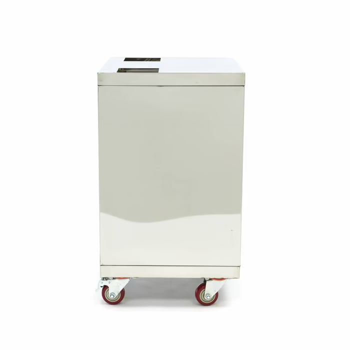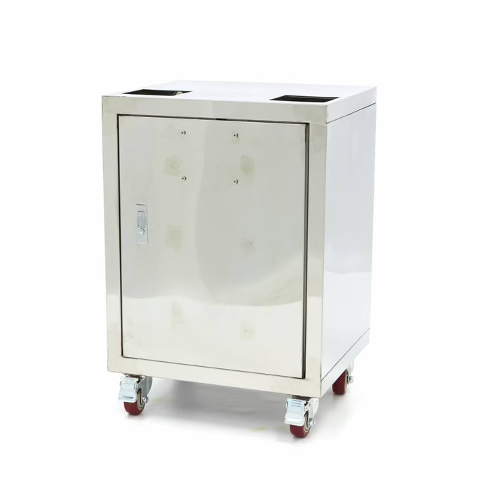 Vagnstativ av rostfritt stål för placering av MAJ-26X och MAJ-50X juicepressar. Inkluderar stor hink för att samla upp allt avfall som uppstår när man pressar färsk juice. Två av de fyra hjulen har en broms så att vagnen, inklusive juicepressen, kan placeras i ett stabilt läge utan att glida. Basen levereras också med en uppsamlingsbricka och tillbehör för att leda avfallet mot sopkärlet.