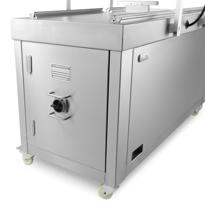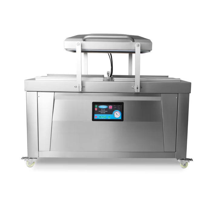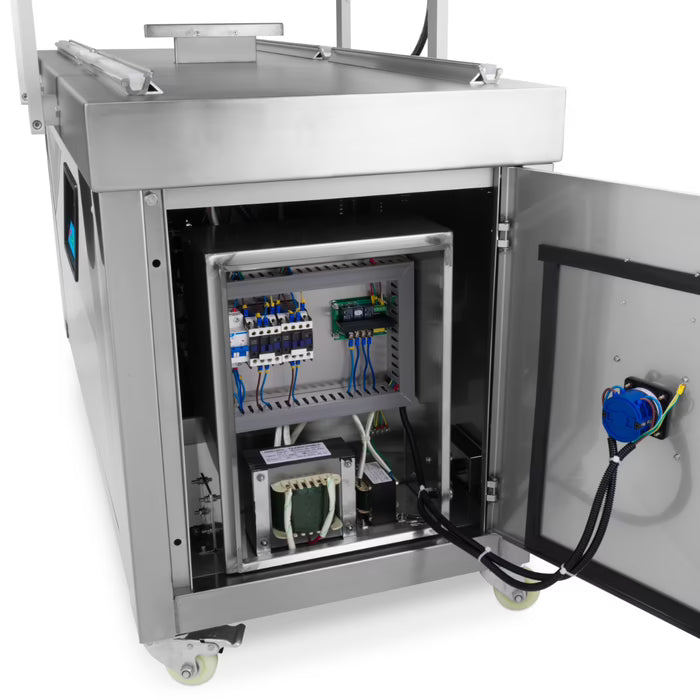 I denna stora professionella vakuumförpackare finns det två separata förslutningskammare för ännu högre förslutningskapacitet. Det finns två svetsbalkar per kammare så att totalt fyra vakuumpåsar på upp till 50 x 55 cm kan användas. Den passar perfekt för upptagna, professionella kök som vill bevara livsmedel längre.